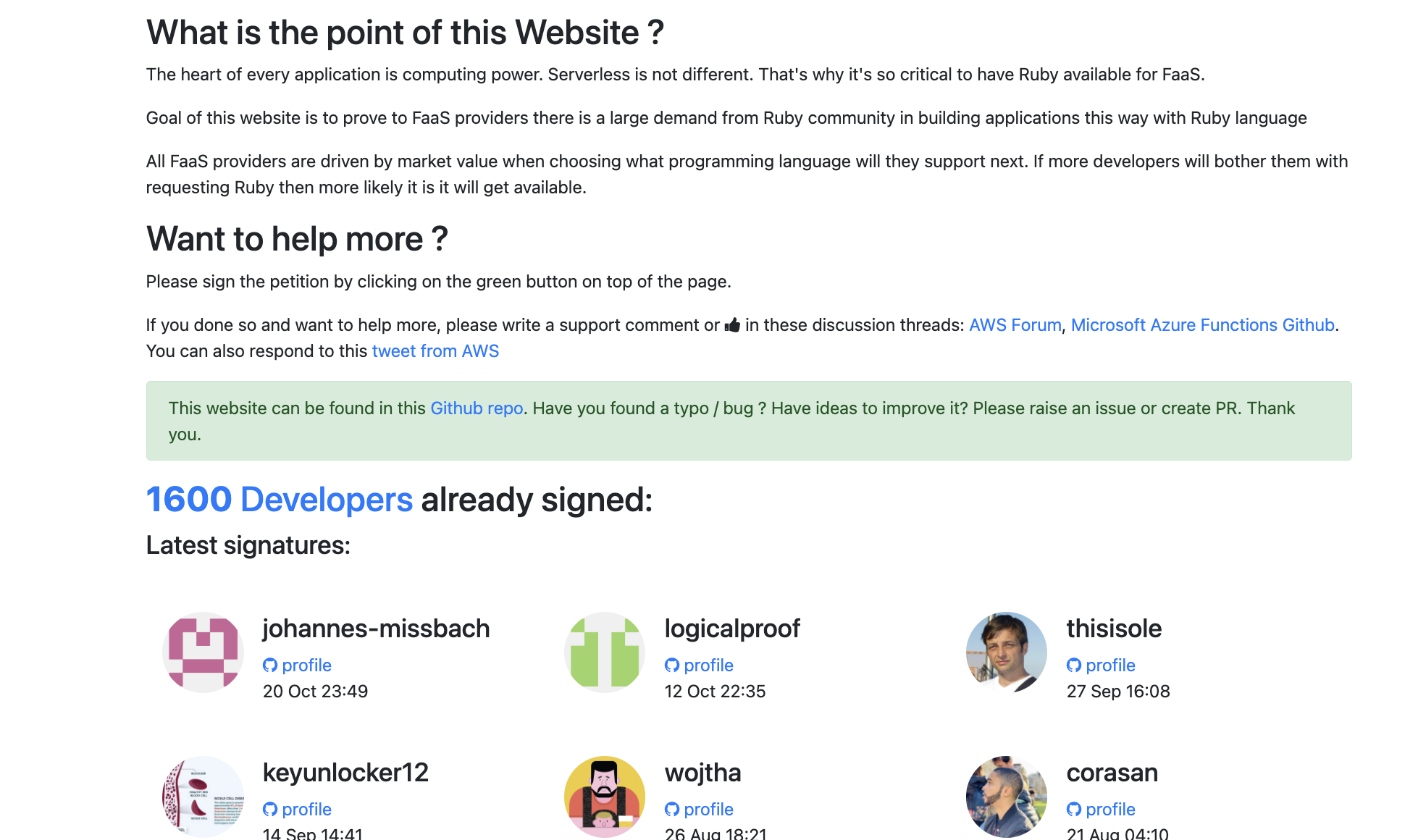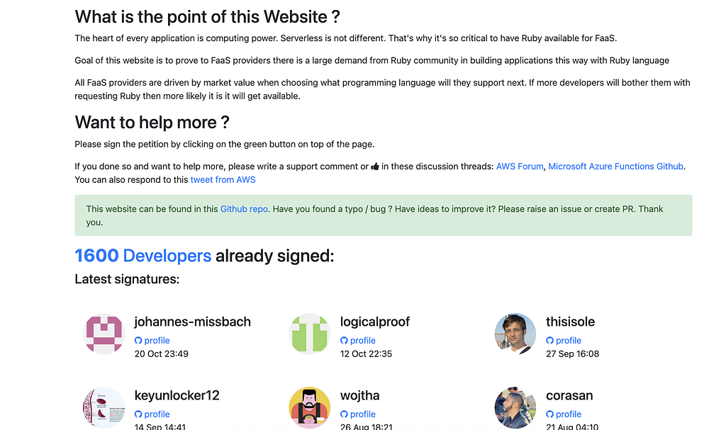 In March 2018 I've launched an online petition hosted on domain serverless-ruby.org to draw the attention of Serverless providers—such as AWS Lambda and Azure Functions—to the viability and popularity of Ruby as a native language in their FaaS (Function-as-a-Service) platforms. Developers could sign the petition using their GitHub accounts. In the end, the petition was signed by 1,602 developers!!