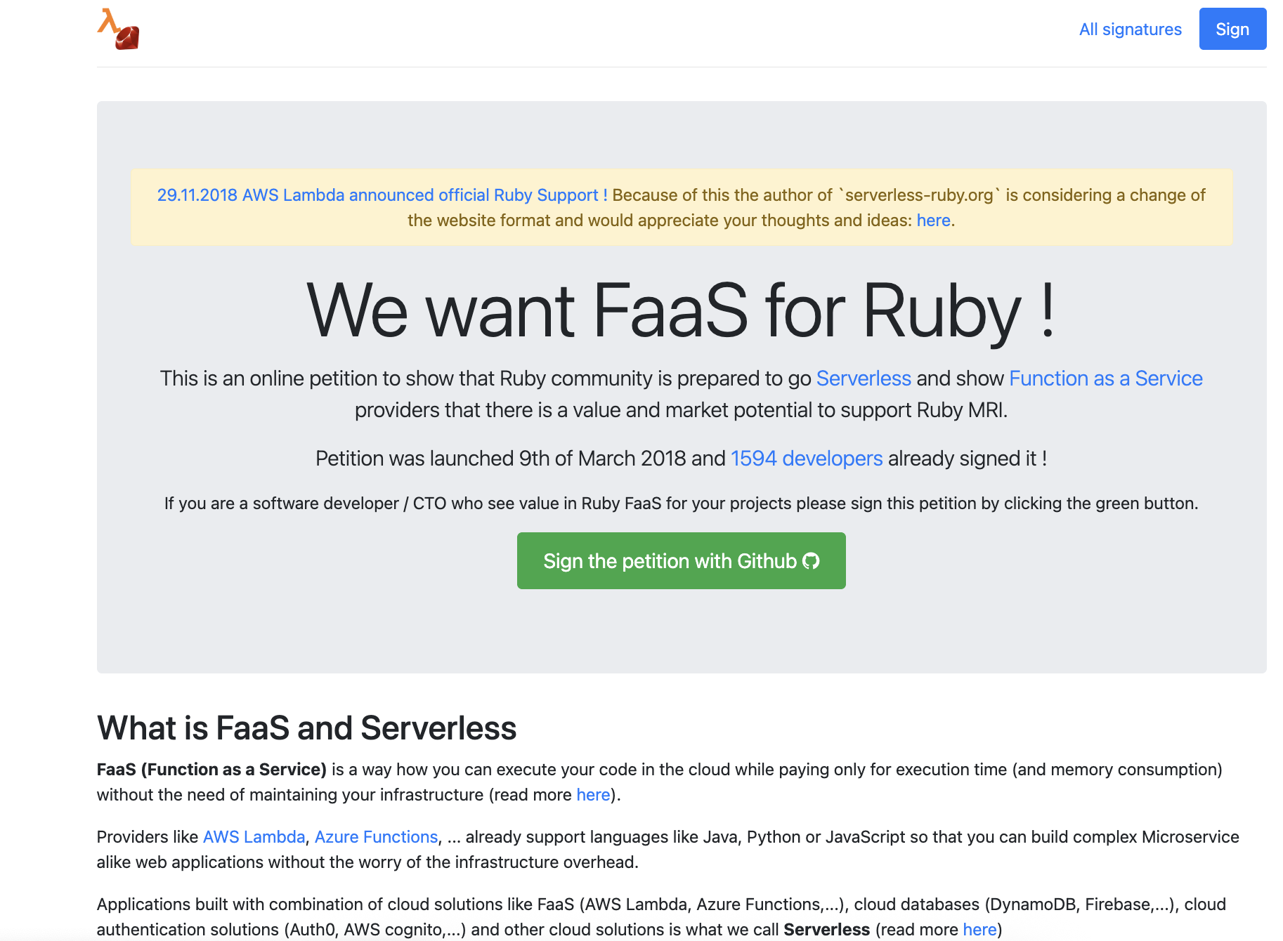 In March 2018 I've launched an online petition hosted on domain serverless-ruby.org to draw the attention of Serverless providers—such as AWS Lambda and Azure Functions—to the viability and popularity of Ruby as a native language in their FaaS (Function-as-a-Service) platforms. Developers could sign the petition using their GitHub accounts. In the end, the petition was signed by 1,602 developers!!