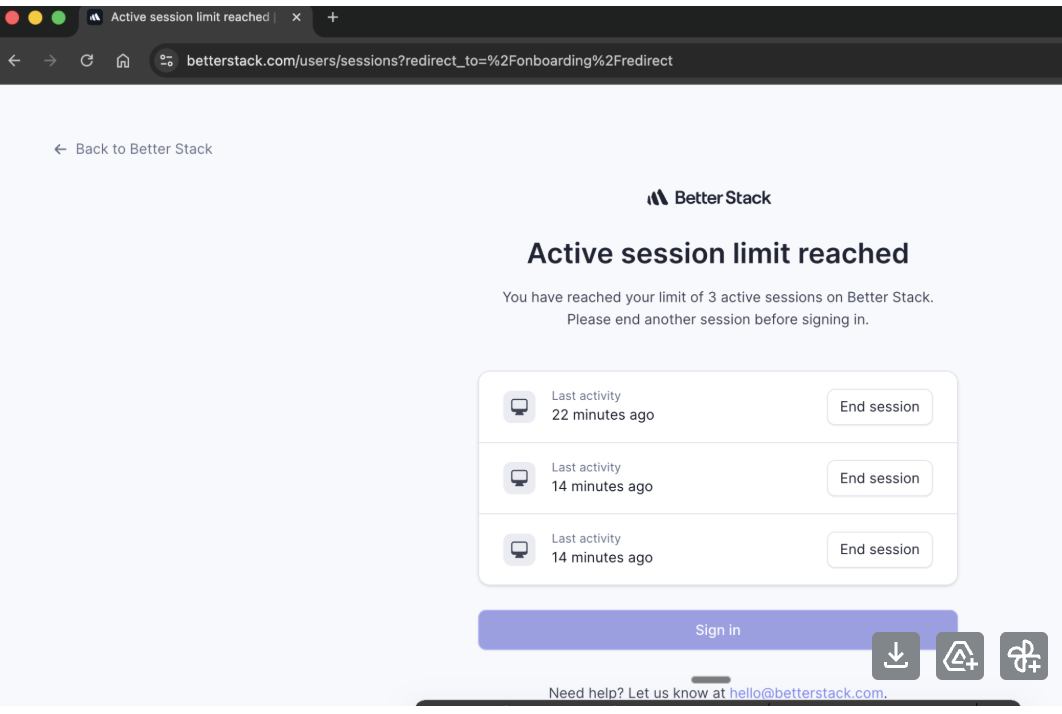 Issue 4: After finishing the onboarding process for uptime, I got stuck in an infinite redirect loop. Now when I access https://betterstack.com/uptime and I click “Sign in” I get redirected to https://betterstack.com/onboarding/redirectI